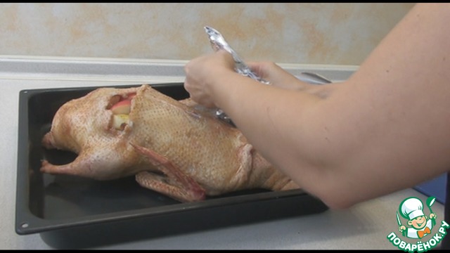 После этого зашиваем ниткой с иголкой или скрепляем зубочисткой утиную кожу. Крылья у утки можно обрезать, а можно обмотать фольгой, чтобы не сгорели, муж у меня любит похрустеть ими.