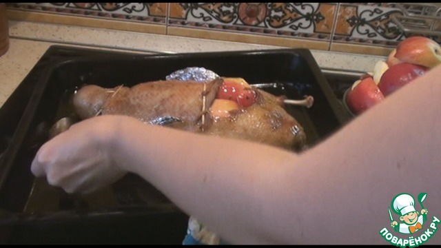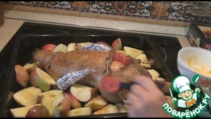 Обкладываем утку оставшимися яблоками и обмазываем медом. Отправляем утку допекаться. Запекаем до того состояния, когда протыкаешь утку возле кости зубочисткой и из неё сочится прозрачная жидкость. Я пекла ещё час. Если у вас духовка сильно жарит можно прикрыть утку фольгой.
