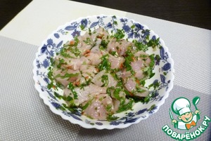 Добавить к индейке мелко нарубленную зелень, чеснок, острый перец, семена фенхеля, немного оливкового масла и соль.