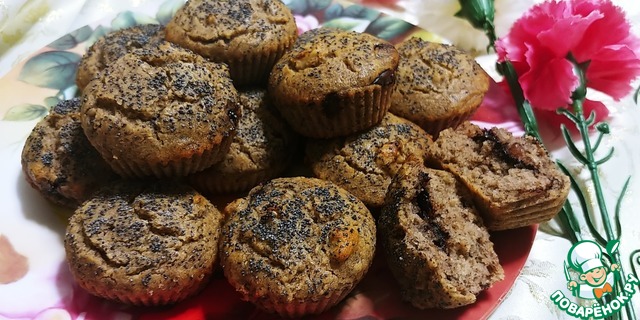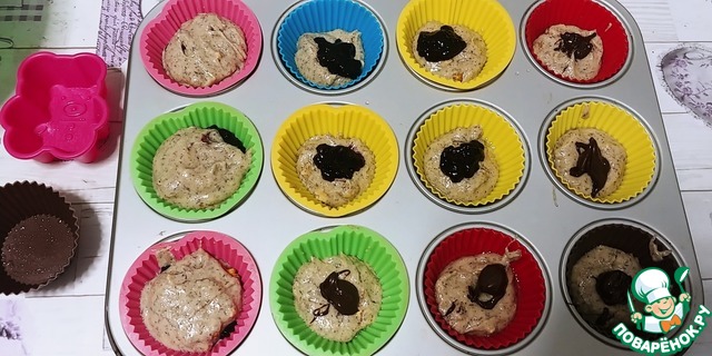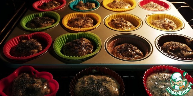 Выкладываем по 1 ст. ложке теста в формы для маффинов/смазать раст маслом) затем 1 чл варенья или нутеллы. Затем закрываем еще одной ложкой теста. Примерно на 2/3 формы. У меня был мак, я решила им посыпать сверху)