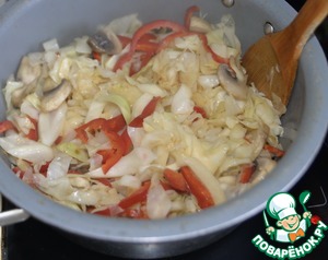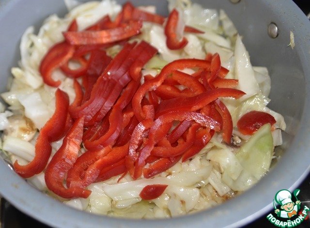 На растительном масле обжариваем капусту с грибами, кладём порезанный полосками болгарский перец.
