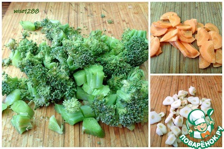 Брокколи разобрать на кочанчики, нарезать произвольно. Морковь нарезать тонко, оставшийся чеснок пластинками.
