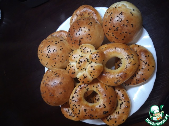 12. Смазываем булочки взбитым желтком, посыпаем кунжутом или тмином (я тем и тем посыпала) и отправляем в хорошо разогретую до 190*С духовку, минут на 30 или до румяной корочки.