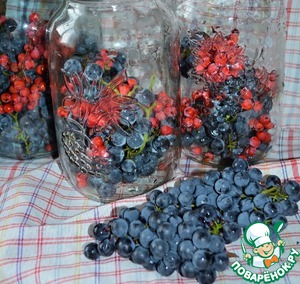 В чистые банки разложить виноград и ягоды рябины, на 1/3.