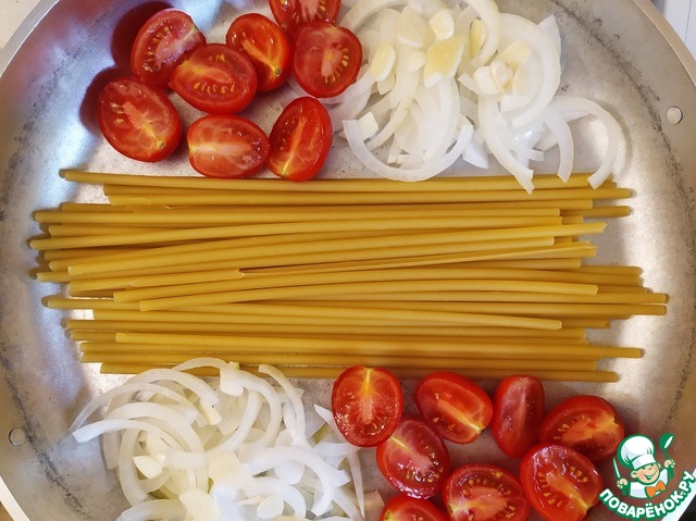• В сковороду кладём спагетти, по бокам нарезанный полукольцами лук и мелко нарезанный чеснок.