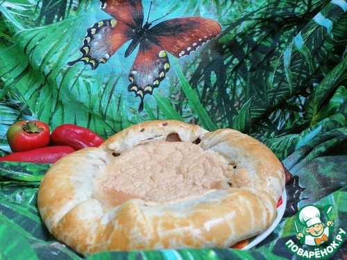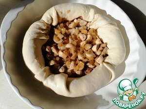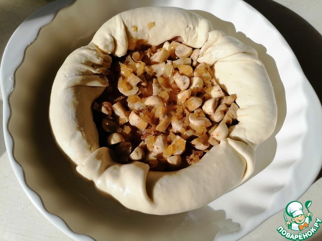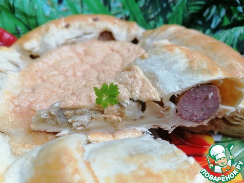 • Грибы и лук нарезать, обжарить на растительном масле, добавить соль и специи по вкусу. Тесто раскатать. По краю выложить купаты, прикрыть сверху тестом. В центр положить грибы с луком.
