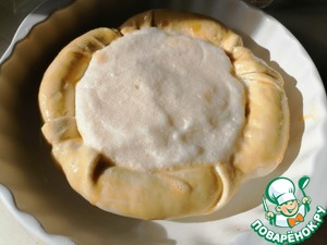 • Ко взбитым белкам добавить желтки, оставив чайную ложку для смазывания пирога. В центр пирога, выложить белки с желтками. Тесто смазать желтком, который оставляли ранее. Выпекать около 50 минут при 175 градусах