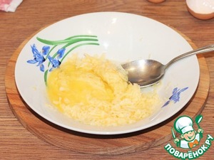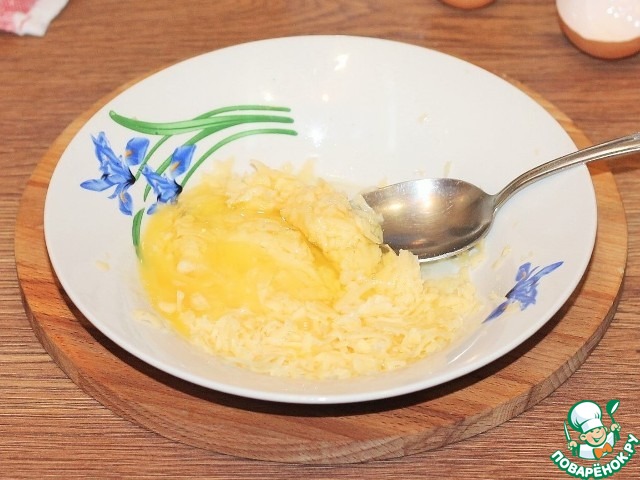 9. Приготовим начинку. Натираем твердый сыр на крупной терке. Сыр вкуснее взять по солоней. У меня сыр двух сортов: твердый и пластинчатый, плавленный.