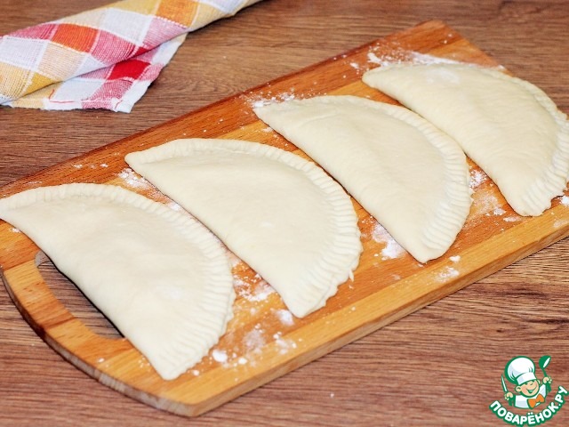 11. На припыленной мукой столешнице, раскатываем колобки теста в круг. У моих кружочков Ф=17-18 см, по рецепту должно Ф=10 см. На одну половинку выкладываем начинку. Показалось мало, решила сверху добавить пластинчатый сыр.
