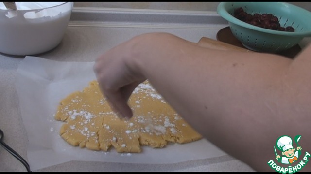 У меня форма прямоугольная, я вырезала по её размеру пергамент с бортиками и прямо на нём раскатала по размеру формы тесто из холодильника. Если нужно припыляйте тесто мукой.