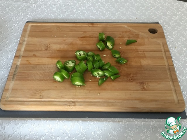 Острый перец нарезаем кружочками. Семена я не удаляю, так блюдо получится острее.