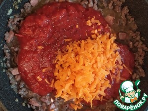 Добавить томатный соус, крупно натёртую морковь, можно ещё поперчить и перемешать. Обжарить пару минут.