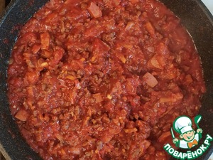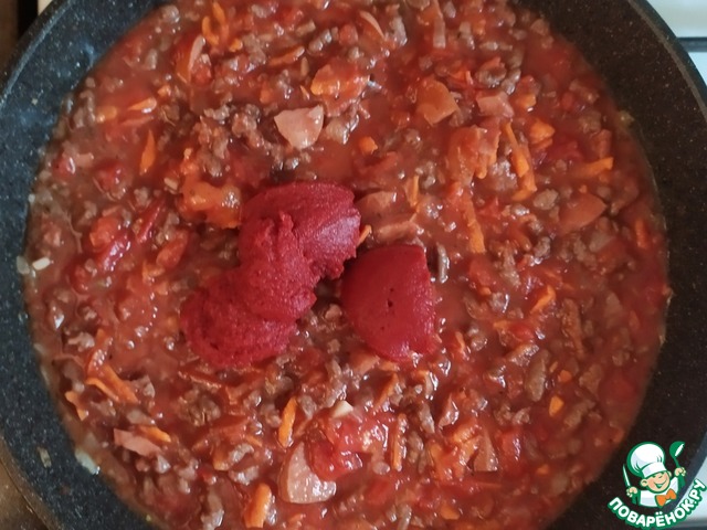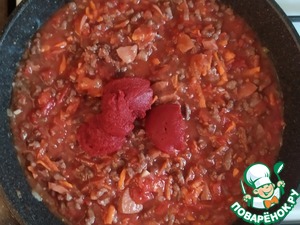 Добавить томатную пасту. Если есть желание - и вино. Перемешать. Готовить около 15 минут, пока смесь не уменьшится и не загустеет.