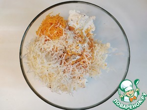 В отдельной миске смешать рикотту, натёртые чеддер и пармезан, молоко и чёрный перец.