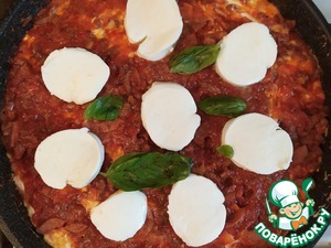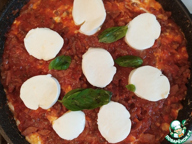 На нём разложить нарезанную кольцами моцареллу и несколько листьев базилика.