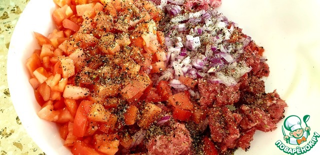 Помидоры и лук мелко нарезать. Смешать с фаршем. Фарш посолить и поперчить.