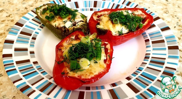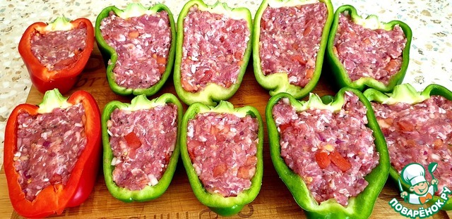 Перцы разрезать пополам и очистить от семян. Наполнить половинки перца фаршем.