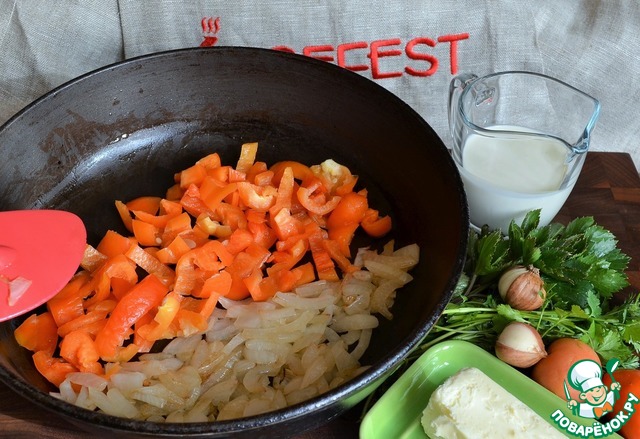 • На растительном масле обжарить лук, добавить резанный перец, жарить 3 минуты, огонь средний.