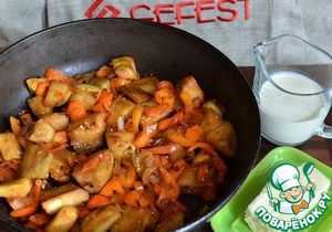 • Баклажан почистить, нарезать, добавить в сковороду.