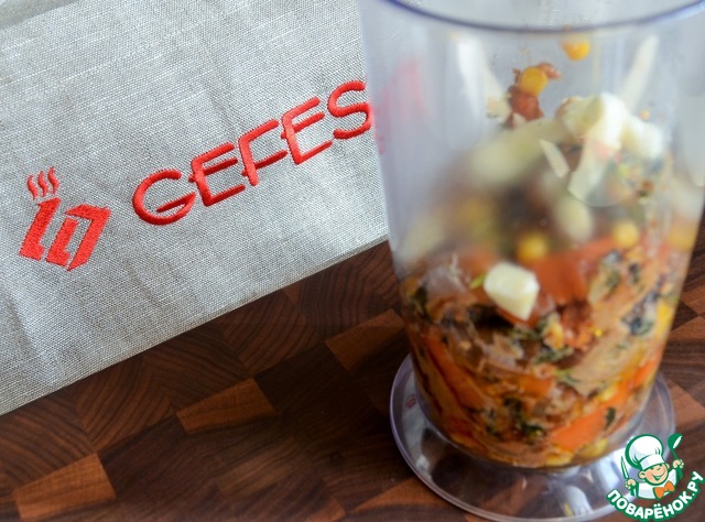 • Дать чуть остыть, измельчить с чесноком до однородности погружным блендером.