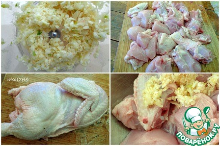 Чеснок измельчить. Курицу порезать на порционные кусочки, добавить приправу, 0,3 чайные ложки соли, чеснок и оставить на 30 минут промариноваться.