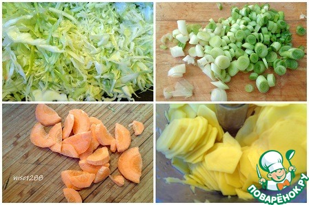 Капусту нашинковать, немного посолить. Зеленый лук нарезать колечками, а морковь и картофель пластиками, посолить оставшейся солью.