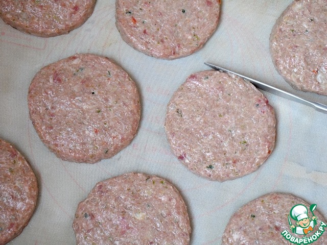 разложила на противне, застеленном ковриком для выпечки. Ещё расплющила котлетки до толщины 10-12 мм, диаметром 9-10см. Плоской стороной ножа разровняла