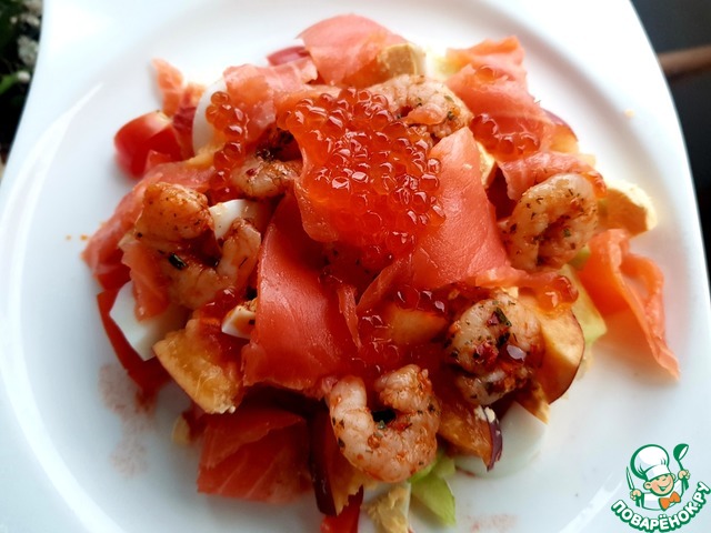 1 )Креветки очистить. Сeмгу, помидор, огурец, яйца, персики мелко нарезать, соединить с креветками.