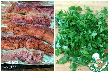 Гольца разделать так, чтобы получилось филе на коже. Противень застелить фольгой, смазать растительным маслом, разложить рыбу и полить соевым соусом. Листики петрушки порезать. Включить духовку разогреваться до 180 градусов.