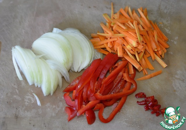 Овощи моем, чистим. Режем лук стрелками, перец и морковь соломкой, жгучий перец колечками.