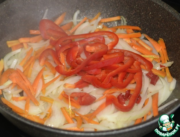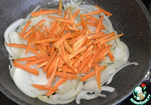 На горячую сковороду наливаем масло, обжариваем до прозрачности лук на среднем огне, при открытой крышке, периодически помешивая около 2 минут. Кладём морковь, перемешиваем, тушим ещё 3 минуты.