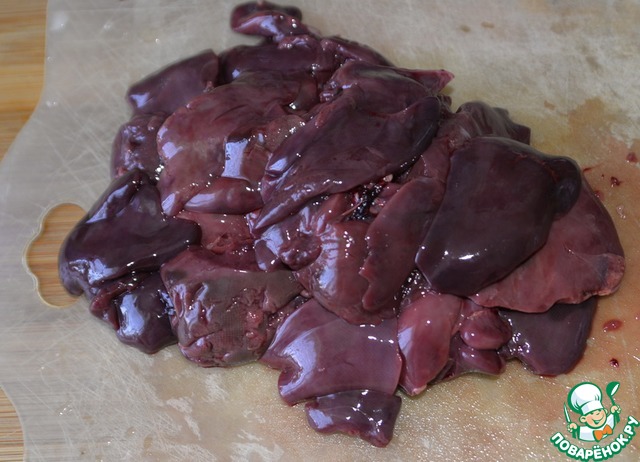 Куриную печень моем, удаляем прожилки, режем на небольшие куски.