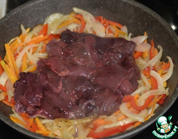 На сковороде раздвигаем овощи к стенкам сковороды, по необходимости доливаем масло, увеличиваем огонь, кладём посредине печень.