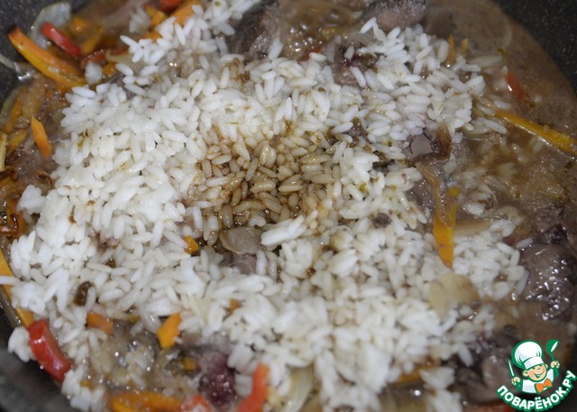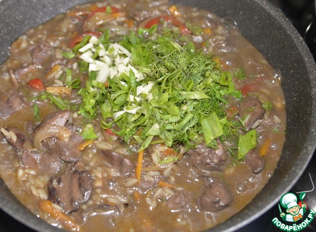 Кладём рис, заливаем бульоном. Бульона много не лейте, овощи и печень дают свою жидкость, я налила много бульона. Добавляем соевый соус, перец, соль (по вкусу). Доводим до кипения и варим на среднем огне, при закрытой крышке 10 минут.