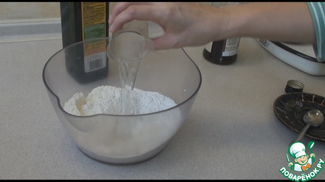К просеянной муке добавляем соль, размешаем. Вливаем уксус или лимонный сок, воду и замешиваем тесто.