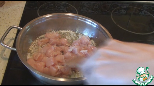 Для начинки на разогретую сковороду нальем немного растительного масла, выкладываю одну мелко нарезанную луковицу, обжарю до прозрачности. Потом добавляю некрупно нарезанное филе. Когда филе схватится, добавляю нарезанные шампиньоны, соль, перец и специи. Обжариваю до готовности.