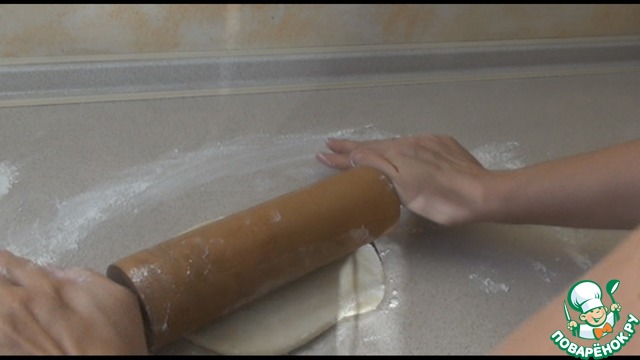 Достаём тесто, делим его на две части. Одну часть раскатываем как можно тоньше в прямоугольный пласт. Стол припыляем мукой.