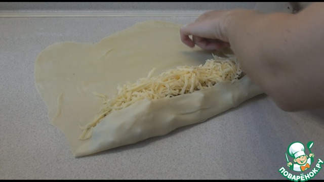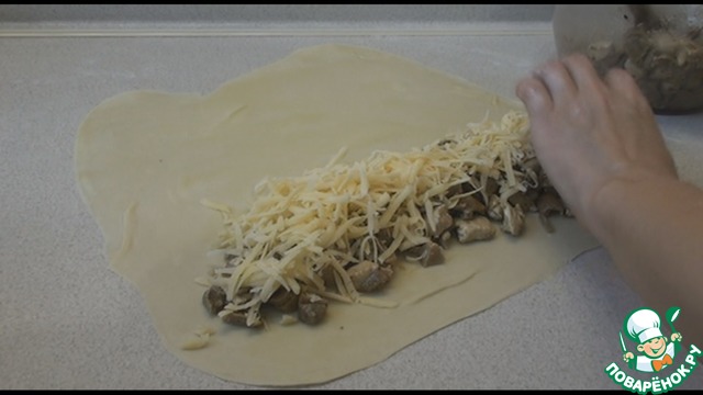 Если начинка очень сочная, добавьте 1 ст л крахмала, размешайте. Раскатанное тесто слегка смажем растительным маслом. С одного краю выкладываем половину начинки, посыпаем половиной натертого сыра.
