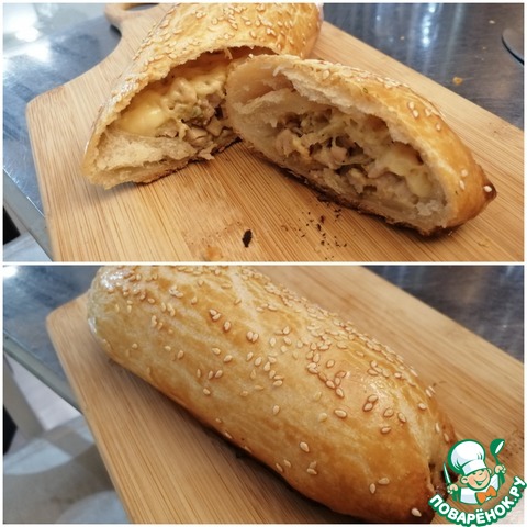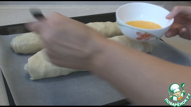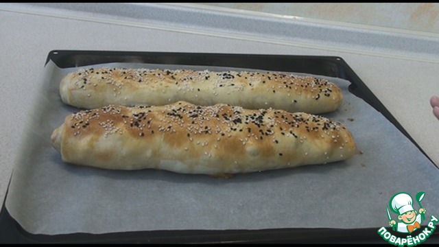 Аккуратно заворачиваем края и сворачиваем тесто с начинкой в рулетик. Противень я застелила пергаментом, выкладываем пирог на противень швом вниз. Аналогично формируем второй пирог.