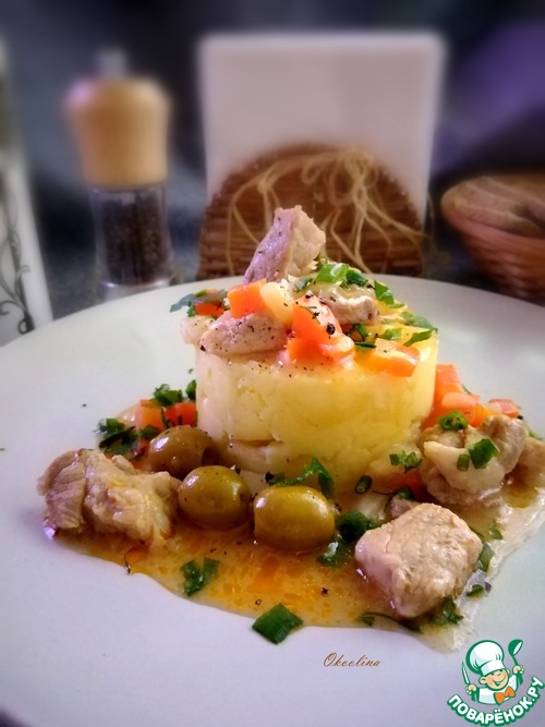 На гарнир я сделала мятую картошку со сливочным маслом. Почему-то поджарку очень люблю именно с пюре картофельным. Выложила его в кольцо, добавила поджарку, поперчила свежемолотым чёрным перцем и присыпала зеленью немного.