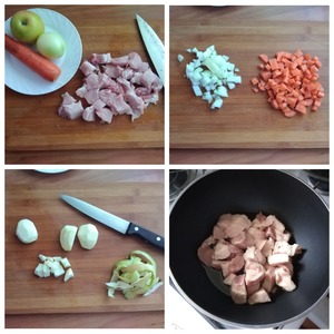Для поджарки я взяла постную свинину и порезала её кубиком небольшим. Овощи: лук и морковь порезала мелким кубиком. Яблоко очистила от кожуры и порезала тоже кубиком. Яблоко нужно очистить. В сотейник налила оливковое масло и выложила свинину. Немного обжарила. Можно обжарить посильней. Вы обжаривайте мясо по своему вкусу.