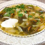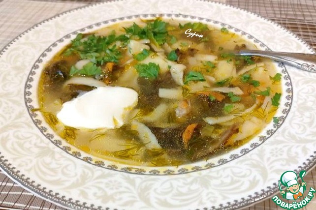 Выложить суп порционно, сверху порей и посыпать зеленью.