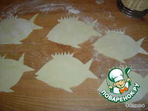 4. Раскатываем готовое слоеное тесто. На него накладываем форму рыбки и вырезаем ножом.