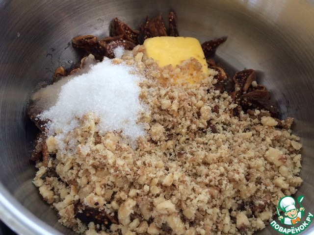 В посуду с антипригарным дном выкладываем все ингредиенты для начинки: порезанный инжир, измельченные орехи, сахар, масло и воду.