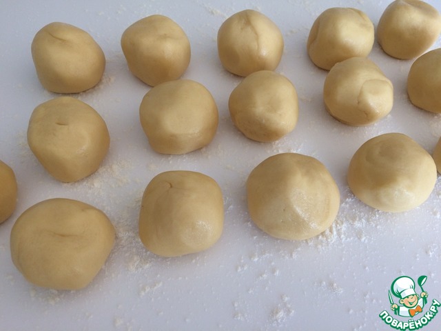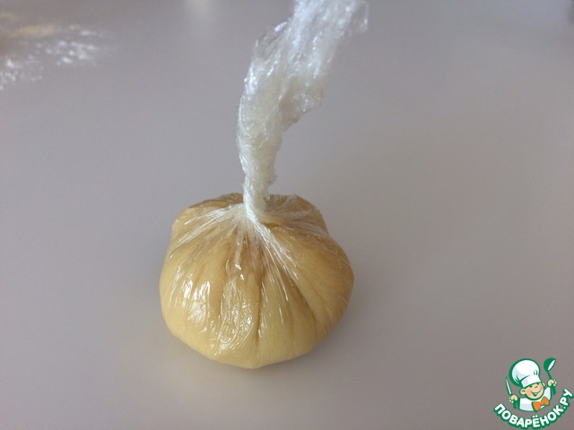 Отрываем от рулона пищевой пленки квадратный кусок. Выкладываем на него шарик теста и приминаем руками в лепешечку около 8 см в диаметре. Сверху кладем чайную ложку с горкой начинки.