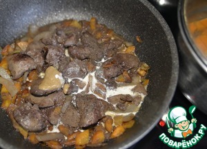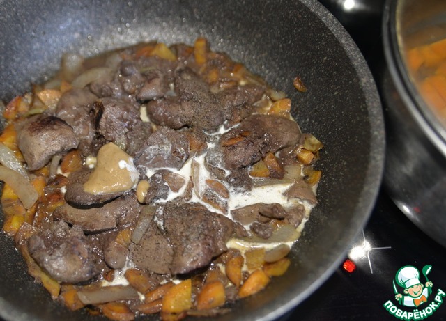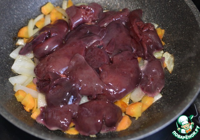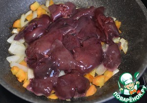 В куриной печени удаляем прожилки, режем пополам и кладём на сковороду к овощам. -