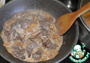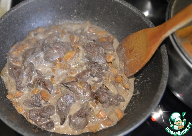 Обжариваем печень около 10 минут до подрумянивания. Добавляем соль, горчицу, перец и сливки.