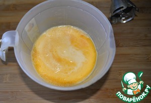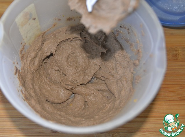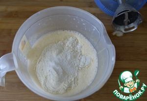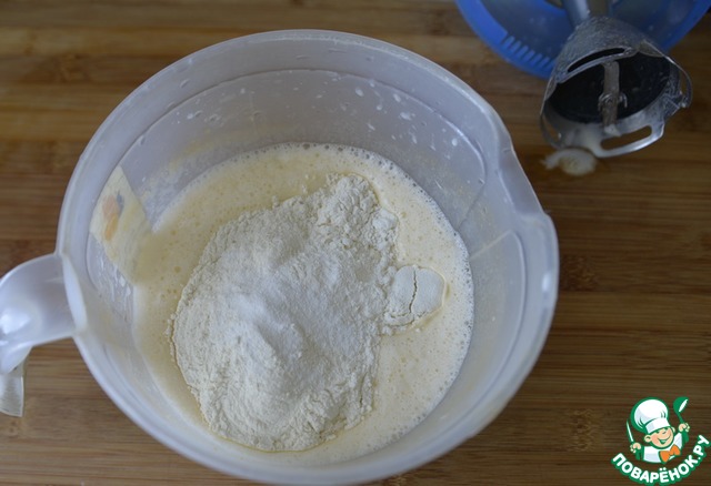 Кладём муку и разрыхлитель, тщательно перемешиваем, чтобы не было комочков.