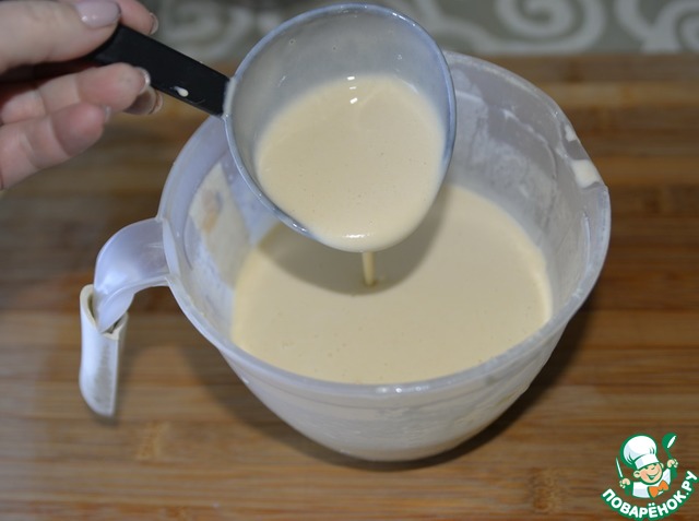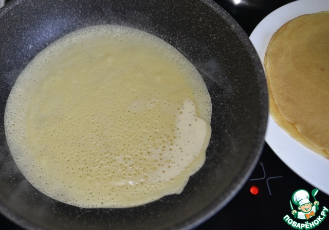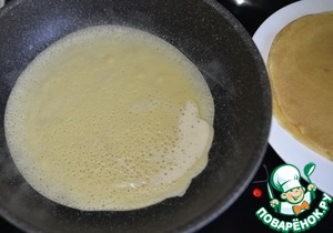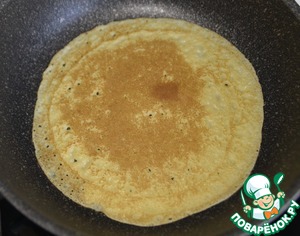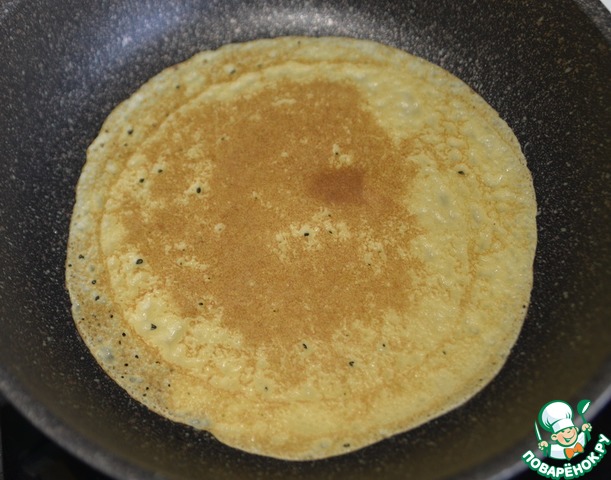 Жарим блинчики обычным способом. У меня сковорода 22 см в диаметре. Смазываем сковороду маслом, наливаем половину половника теста, равномерно распределяем по сковороде. Жарим на среднем огне, пока не "схватится" тесто, далее переворачиваем.