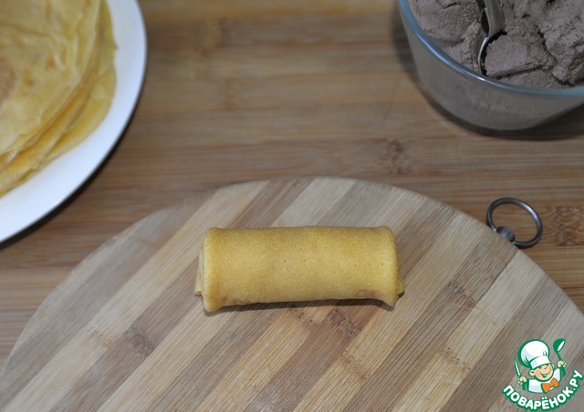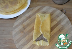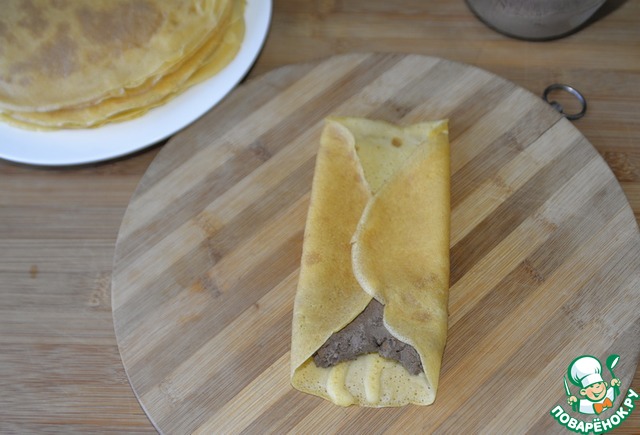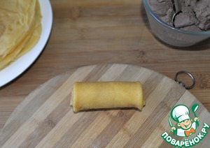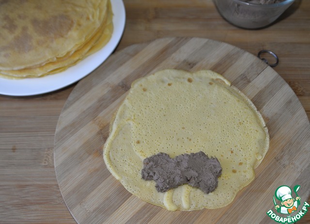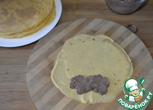 Даём блинчикам слегка остыть, но они и не должны быть совсем холодными, иначе утратят свою эластичность. На край блина кладём около 2 ст. ложек паштета.